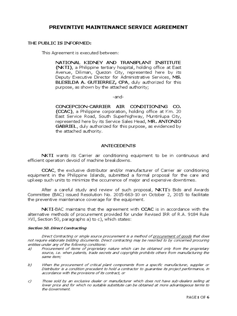 Preventive Maintenance Service Contract Sample. The maintenance services that must be executed should be mentioned early in the contract. Equipment distributors and similar companies in the business of selling or leasing equipment, machinery and hardware that require upkeep often augment their sales and financing activities with service contracts.